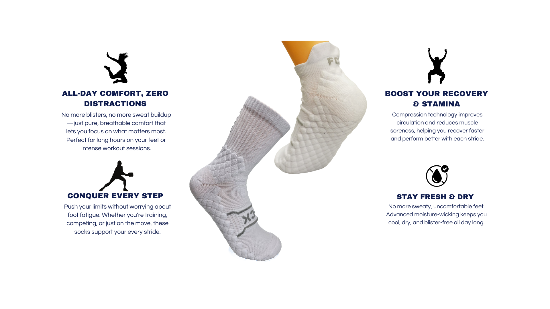 Every step feels soft, light, and effortless — like walking on clouds. That's because inside these socks, we've built an advanced Honeycomb Cushion System. This unique design features strategically placed honeycomb-shaped padding zones that absorb impact and evenly distribute pressure across your foot.